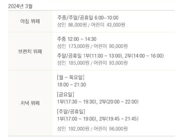런치 타임 (12:00-14:30) • 성인: 173,000원 • 어린이: 90,000원