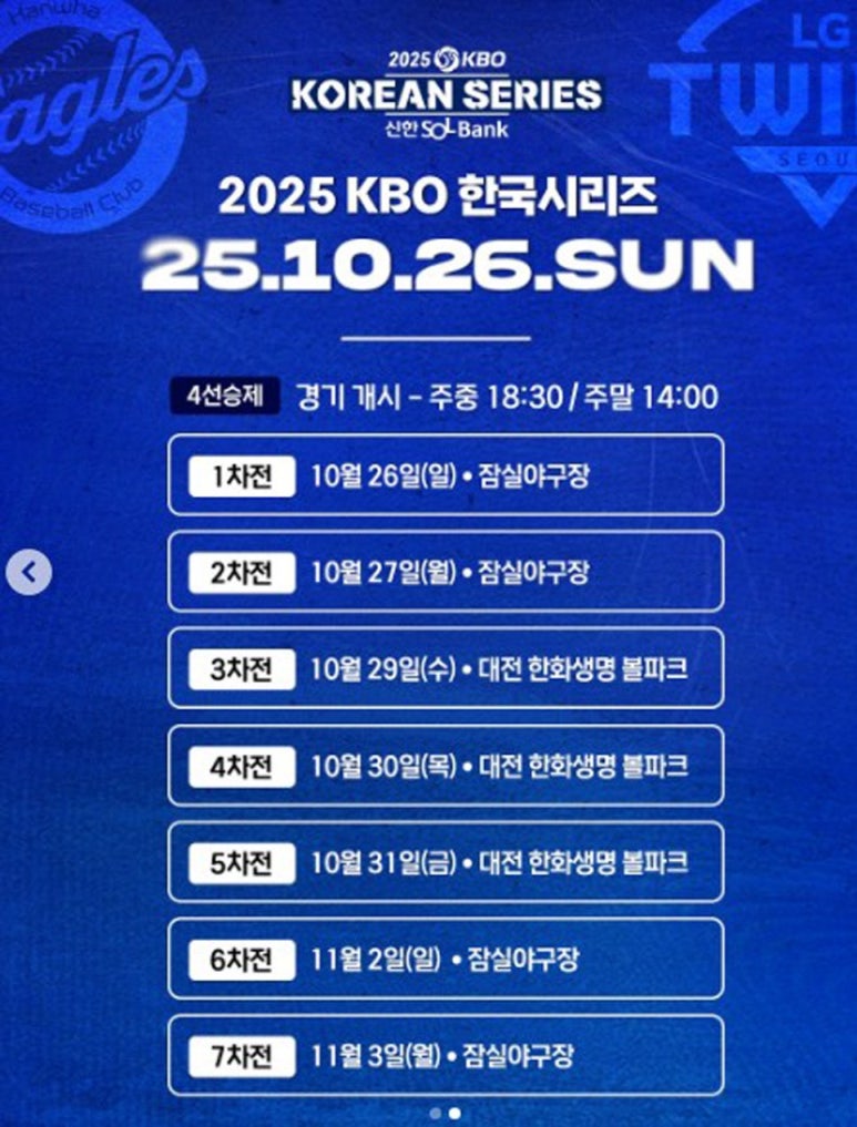 1차전은 10월 26일 일요일 오후 2시 잠실구장에서 시작되며, 2차전은 10월 27일 월요일 저녁 6시 30분 같은 장소에서 열립니다. 이후 무대는 대전으로 옮겨져 10월 29일 수요일부터 31일 금요일까지 3경기가 연속으로 진행됩니다. 만약 승부가 갈린다면 11월 2일과 3일 잠실구장에서 6·7차전이 펼쳐집니다.